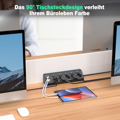 Ecksteckdose mit USB, 5 Fach Steckdosenleiste mit Schalter, Mehrfachsteckdose Steckerleiste mit 2 USB und 2 Type-C, 9 in 1 Überspannungsschutz mit 2M Kabel für Smartphones Tablets, Hause, Schwarz