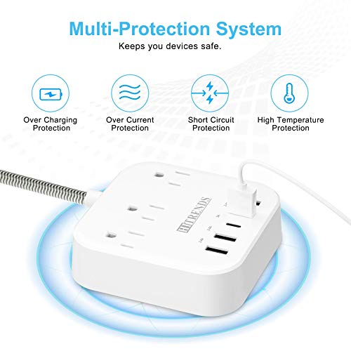 【Powerful Power Strip】 Comes with 10 ft 3 AC outlets (1875W/15A) and 4 USB ports (5V/2.4A) and 1 USB-C Port (5V/3A), the surge protector is suitable for most household appliances and mobile devices. With ETL listed, the USB power strip is the best choice for your home and office use.