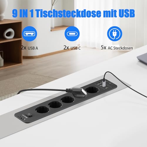 Versenkbare Steckdose mit USB, 5 Fach Einbausteckdose mit 2 USB, Tischplatte Versenkte Steckdose mit 2 USB C, Einbau Steckdosenleiste mit 2M Kabel für Arbeitsplatte Möbel, Schwarz